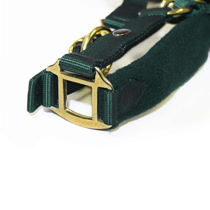 Synthetic horse halter made of durable nylon, adjustable with brass buckles. Soft fleece padding on the noseband and headpiece helps protect the horse from rubbing and pressure. Available in several colors, this nylon halter is versatile and suitable for everyday use.