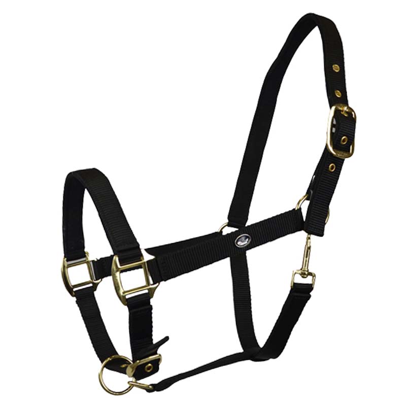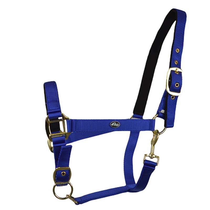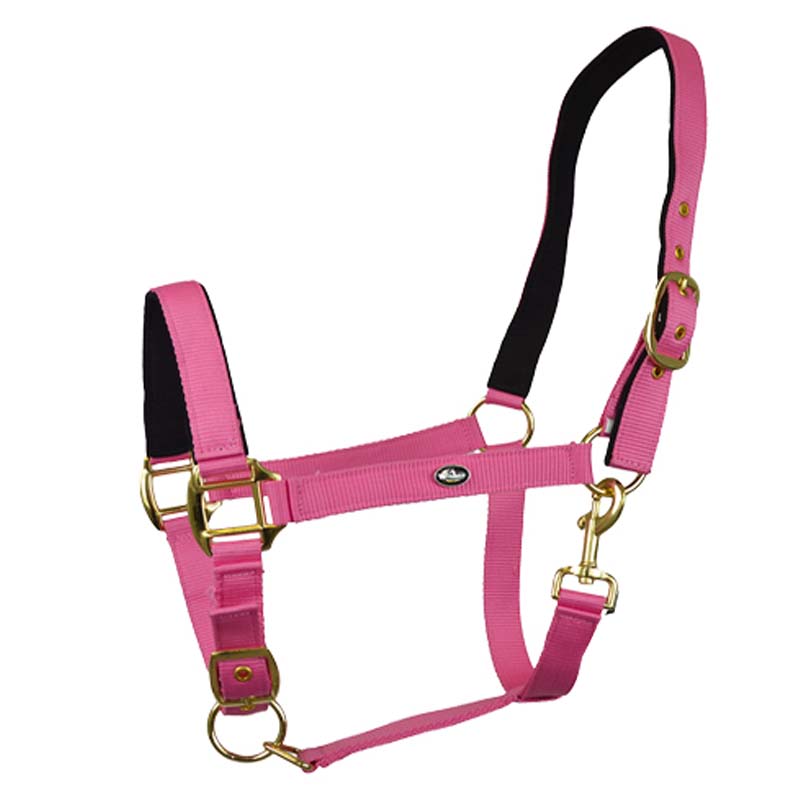 Double nylon Nabuk covered halter, very strong with double settings and sprin clip. Brassed metal bucale.