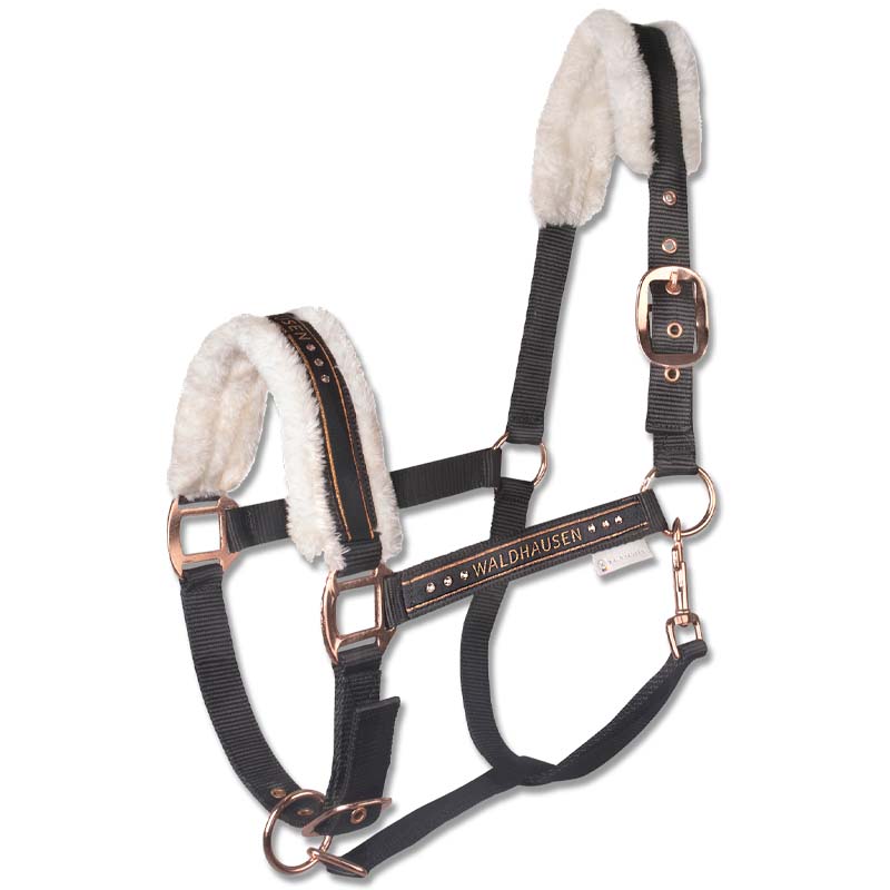 Halter with elegant and soft padding on head and noseband, created specifically with synthetic fur and glitter to make it unique and original of its kind. It is adjustable on the underarm and on the overcap to allow your horse to feel at ease in all his movements. The buckler is satin and you can find it in various colors