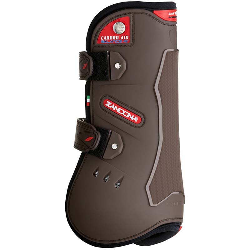 Tendon boots Zandonà model Carbon Air Balance VELCRO with magnetic device. Externally made of TPU, with differentiated thickness, support in perforated neoprene and equipped with ventilation outlets on the fetlock. Gel-Tech membrane to absorb shock and cushion for comfort. Shell with Carbon fiber elements, for thermally insulate the joints from the heat generated by friction, and to increase the mechanical resistance to impacts. Closing with Velcro straps, quick release system, can be replaced. This model is provided with a magnetic device that increases the dynamic balance of the horse improving cellular functions. It has been reported that this magnetic induction, placed in a strategic point of the limb, decreases substantially muscle fatigue as it facilitates lymphatic circulation due to an increase of the vascular blood flow. Thanks to this device is guaranteed an improvement in the performance of the horse. Certificate Ricotest. Product completely realized in Italy. Price is intended for the pair.