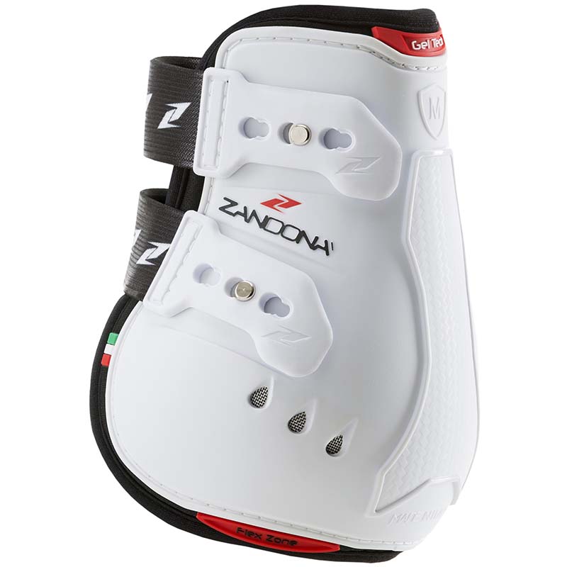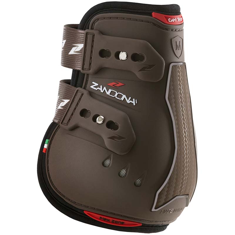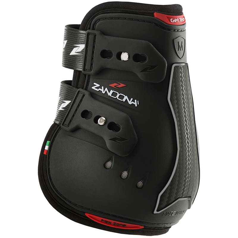 Fetlock boots Zandonà model Carbon Air Fit. Externally made of TPU, with differentiated thickness, support in perforated neoprene and equipped with 6 ventilation outlets on the fetlock. In the outer zone of the pastoral, there is an area specially designed for flexibility (Flex Zone), the size and shape have been specifically designed to be more ergonomic as possible. Gel-Tech membrane to absorb shock and cushion for comfort. Shell with Carbon fiber elements, for thermally insulate the joints from the heat generated by friction, and to increase the mechanical resistance to impacts. Closing elastic straps with quick-release tip, suitable for a secure closure. Certificate Ricotest. Product completely realized in Italy. Price is intended for the pair.