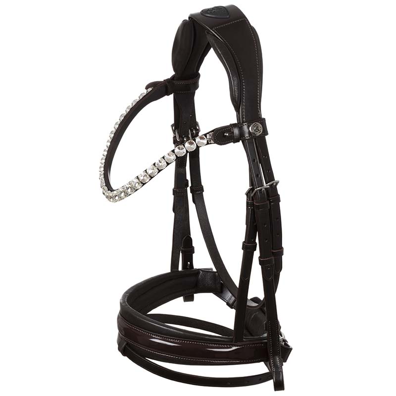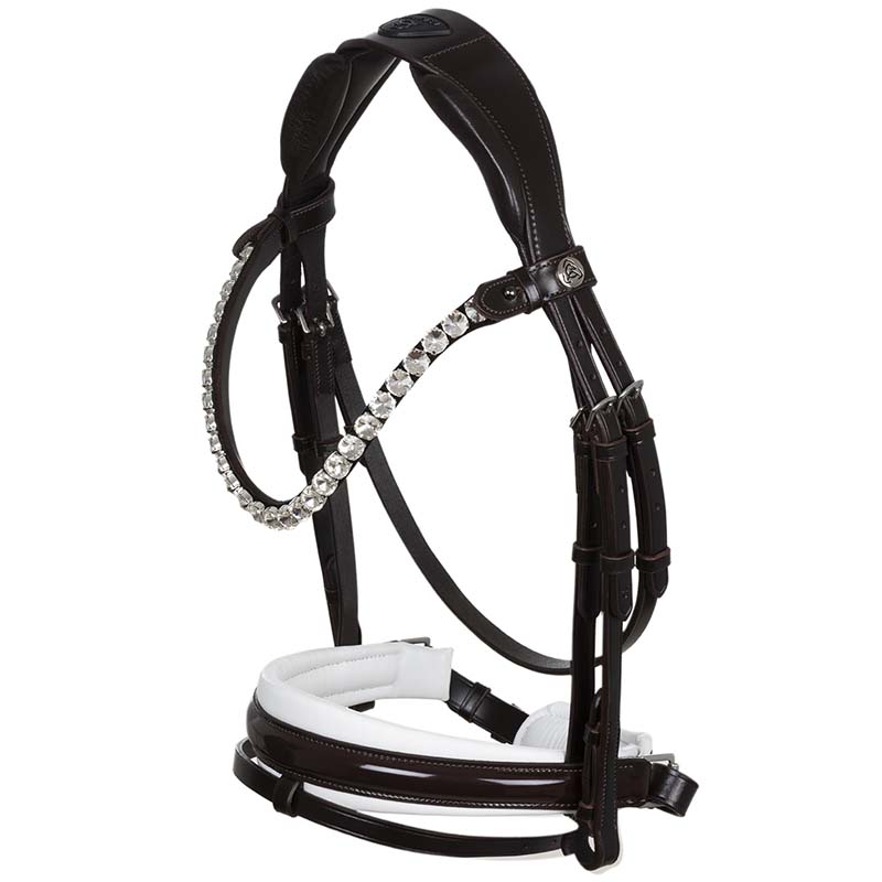 Acavallo Ophelia bridle made from high-quality Italian leather, featuring a crystal-decorated browband, padded headpiece, and noseband lined with soft latex. The Acavallo Ophelia bridle is a uniquely styled equestrian accessory, with refined, sparkling details, perfect for high-level competitions and special occasions. Crafted from Italian calfskin leather, this bridle offers lasting durability and comfort for the horse. The anatomical headpiece reduces pressure on the horse’s head. The padded browband is adorned with crystals along its entire length, while the glossy noseband with a soft latex lining is decorated with contrasting piping in black or white. The Ophelia bridle is fully adjustable with stainless steel buckles for a perfect fit.