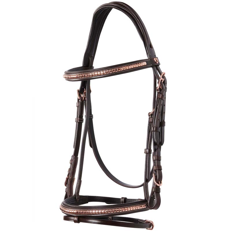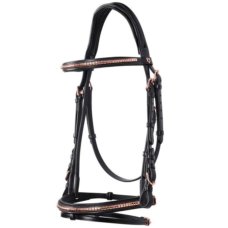Equestro English bridle in Italian leather, Clincher Rose Gold model with adjustable throatlatch and noseband. This English riding bridle is made from genuine leather, featuring an anatomically padded browband and noseband adorned with rose gold details and buckles. The adjustable throatlatch and noseband ensure maximum comfort and a customized fit for your horse. Note: The rose gold decorations are plated and may oxidize or slightly change color over time. Reins are NOT included.