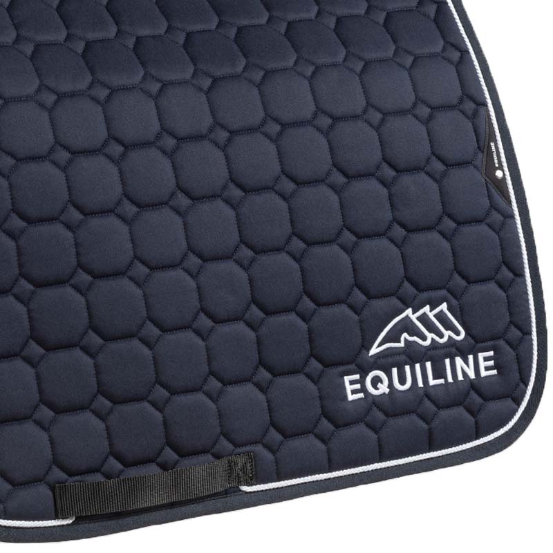 English saddlecloth Equiline model Outline, with embroidered logo Equiline. In ACS2 material composed of inner layer 100% soft cotton, padded with pure wadding 900gr. that allows maximum breathability and exceptional shock absorption effect. Always maintain adequate thickness between the saddle and the horse's back. Preshrunk and anti-allergic fabric, the inner lining is in natural ecru color, to prevent the colorants from coming into contact with the horse, contributing to an even greater respect for the environment.
