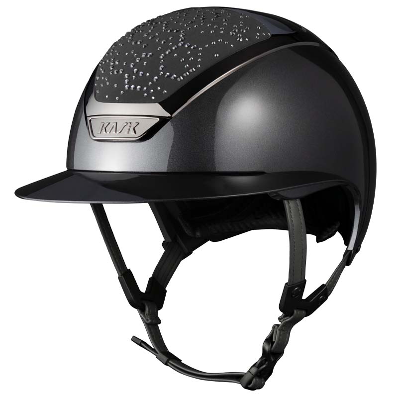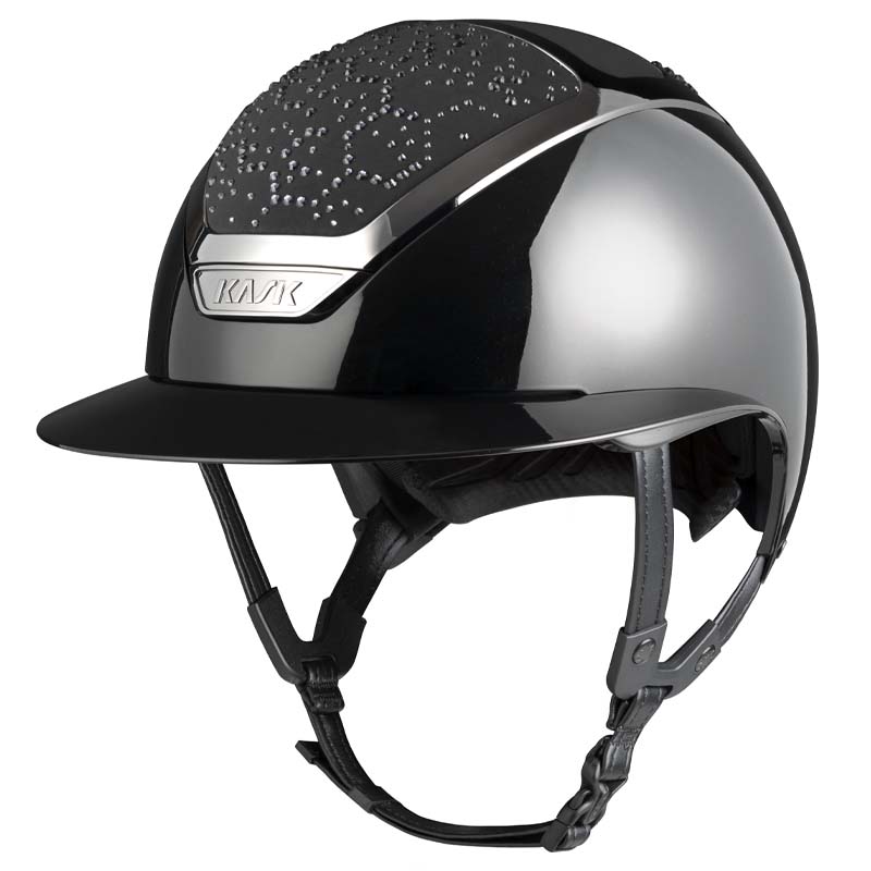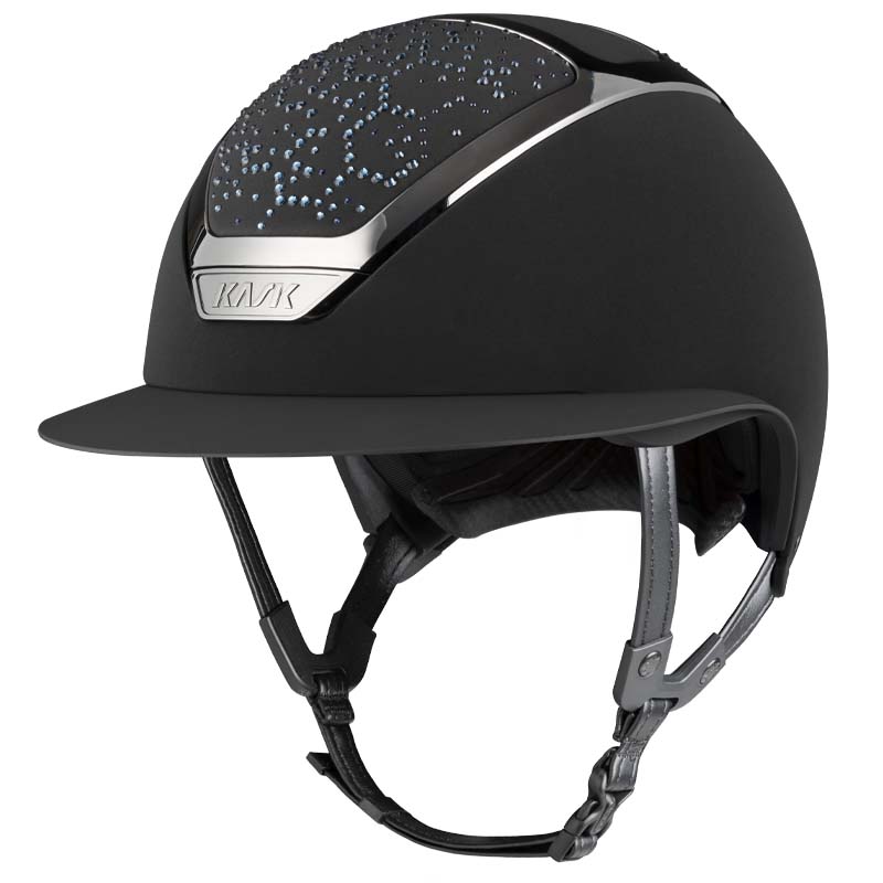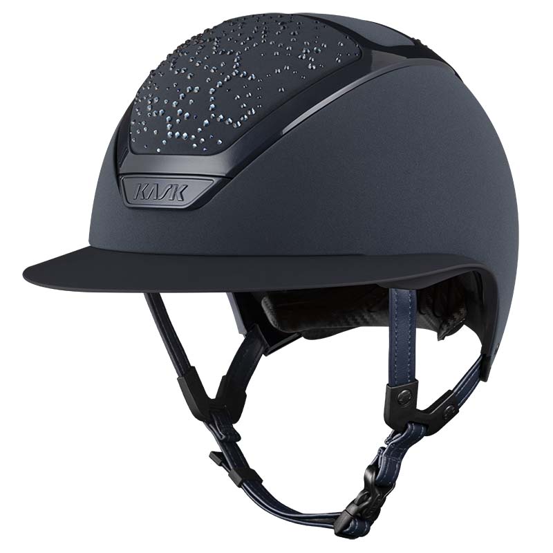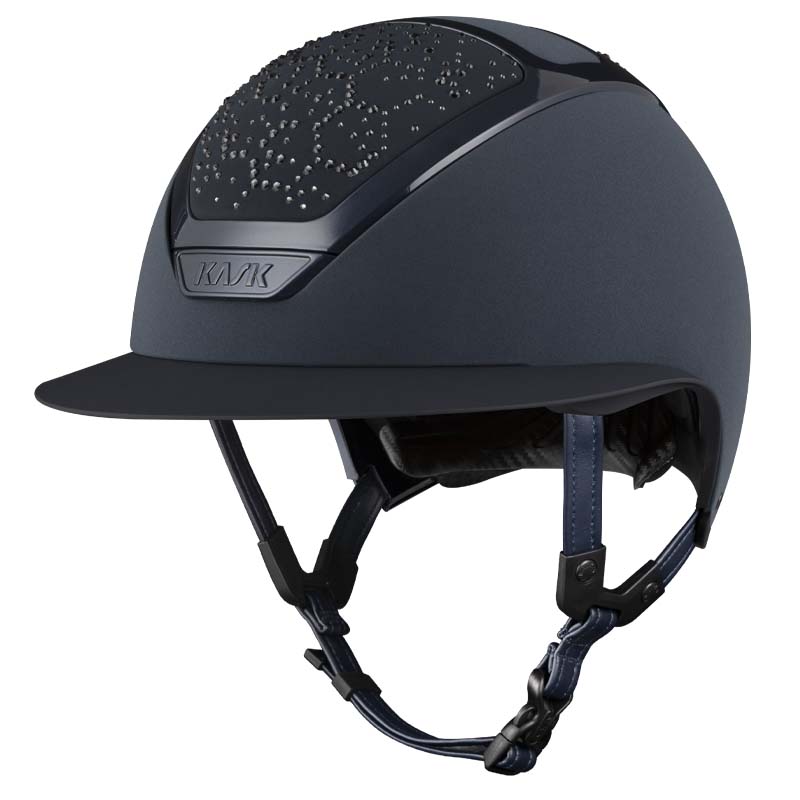 The KASK Star Lady ANIMA helmet is a premium wide visor model, appreciated by riders who seek elegance and safety, especially for high-level competitions. The front and rear parts of the shell are covered in fabric and decorated with crystals in the Vibe configuration, featuring a distinctive honeycomb-style design. The helmet can be fully customized, choosing between glossy or matte finish and 3 different Swarovski colors: Montana Mix, Graphite Mix and Greige.