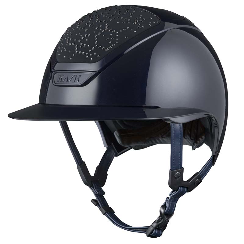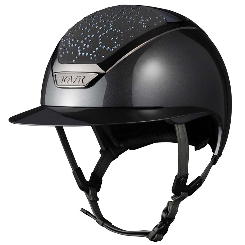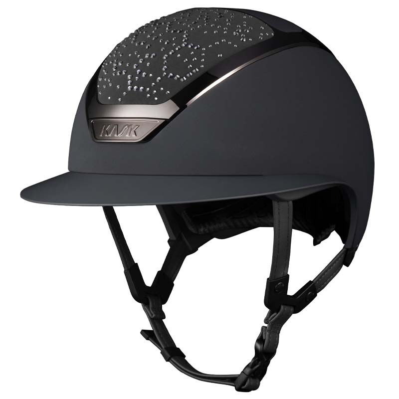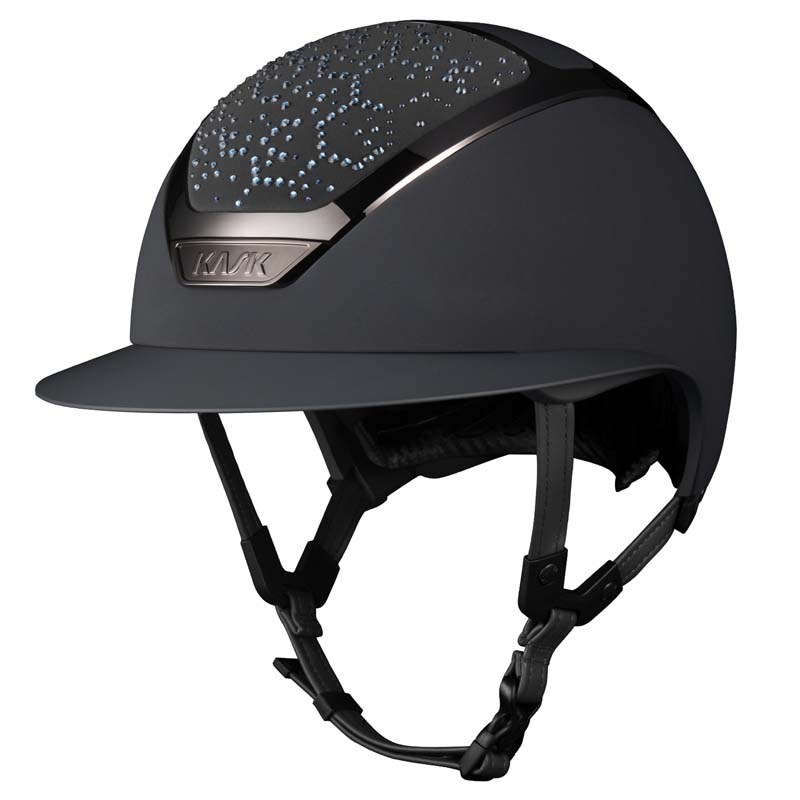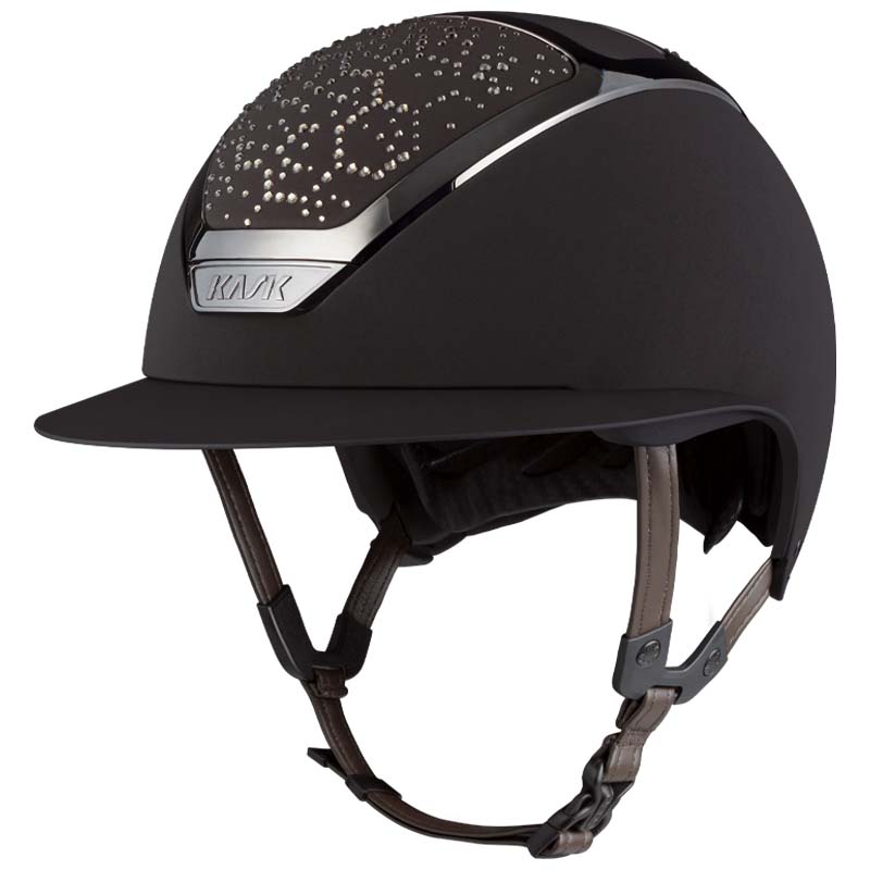 The KASK Star Lady ANIMA helmet is a premium wide visor model, appreciated by riders who seek elegance and safety, especially for high-level competitions. The front and rear parts of the shell are covered in fabric and decorated with crystals in the Vibe configuration, featuring a distinctive honeycomb-style design. The helmet can be fully customized, choosing between glossy or matte finish and 3 different Swarovski colors: Montana Mix, Graphite Mix and Greige.