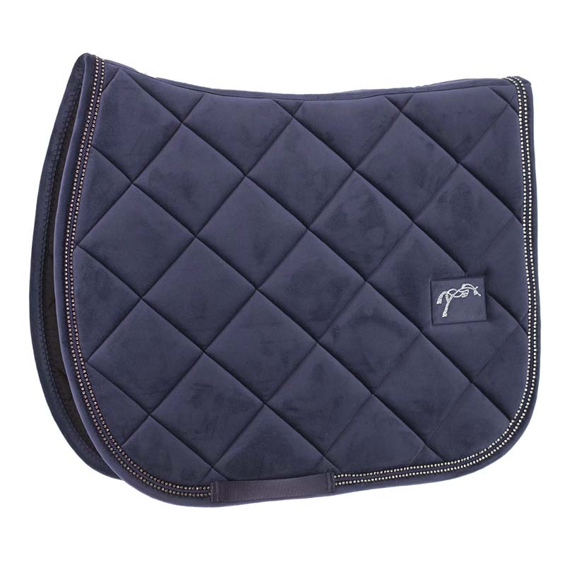 Jumping saddle pad by Penelope, New Strass model, quilted in velvet-effect fabric with rhinestone trim. The New Strass saddle pad is the perfect accessory for English riding, designed for riders who seek a feminine and elegant style. Made of technical velvet-effect fabric, this saddle pad features diamond quilting and padding that reduces pressure on the horse’s back. The decorative cord is embellished with two lines of rhinestones, adding a touch of sparkle. Fabric: 100% polyester (outer, lining, and padding) Saddle pad dimensions (FULL): Height 50 cm, Length 60 cm