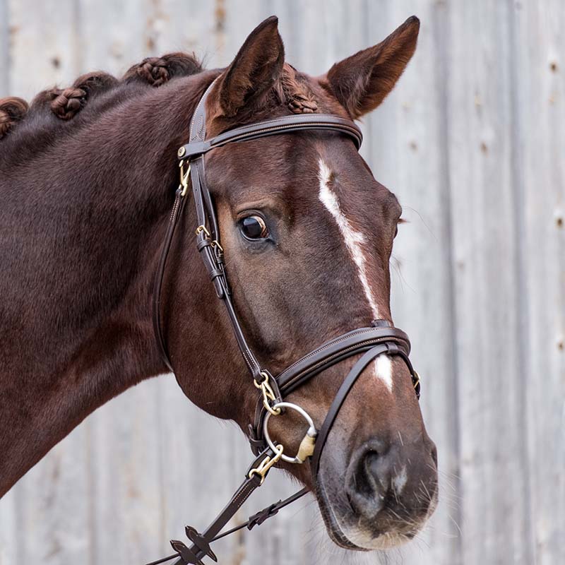 English bridle Horsena model in leather and calfskin, with ergonomic padding and anatomical design, featuring a removable flash noseband. Made in Italy. The Horsena Work bridle is crafted from high-quality leather and genuine calfskin, with stainless steel buckles and contrasting stitching. Its anatomical design, made in Italy, is developed to ensure maximum comfort for the horse. Neoprene padding is applied over the buckles, chin strap, and lateral sections of the crownpiece to protect the skin from rubbing and pressure points. The cheekpieces are placed away from the horse’s cheekbone, eliminating the risk of abrasions in delicate areas of the face. • Padded leather noseband with neoprene chin strap, protecting from buckle contact and preventing abrasions. • Anatomical design and optimal fit, with a contoured crownpiece that reduces pressure and cheekpieces positioned away from the cheekbones. • Stable and easy-to-replace browband with buttons. • Neoprene padding to prevent injuries and skin irritation. Reins not included.