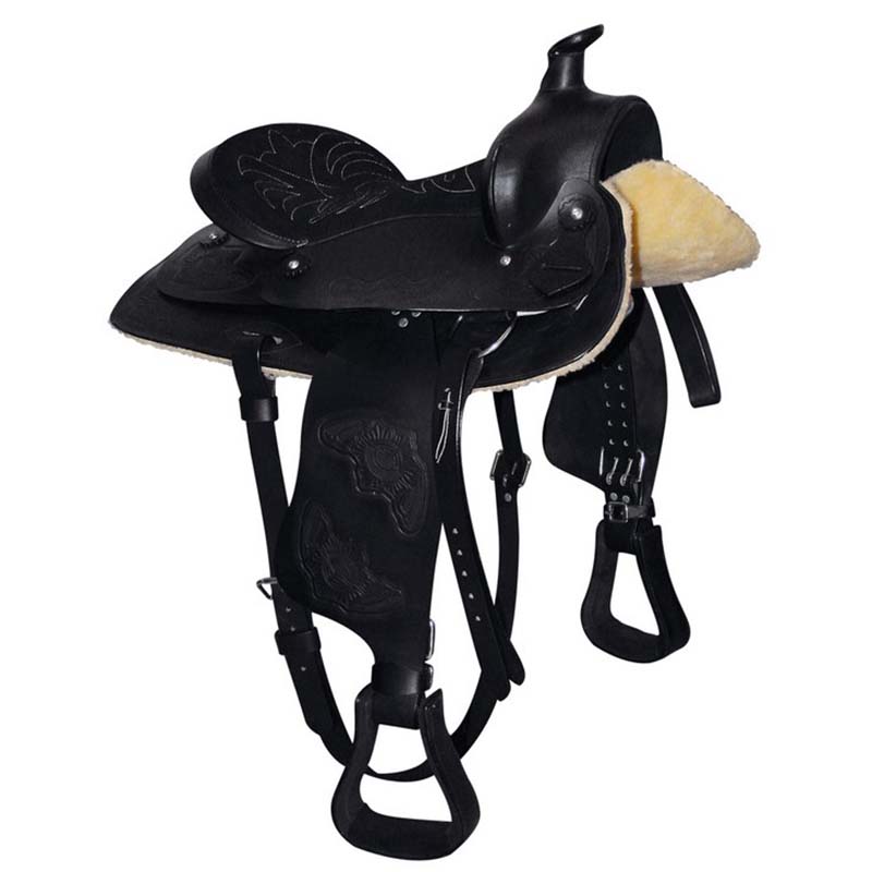 Western cheap saddle, floral leather tooled, embroidered suede seat, leather lined stirrups, supplied with back girth.